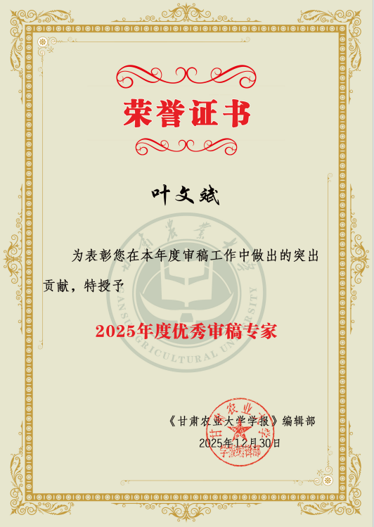 此次叶文斌、王昱教授同时获评优秀审稿专家,是《甘肃农业大学学报》编辑部对两位教授个人学术能力的高度肯定,更是对我校农林学科建设成果与师资队伍水平的认可,为学校农林学科进一步提升学术影响力、深化行业交流合作奠定了坚实基础。我院也将以此为契机,进一步加强学科建设与师资队伍培养,聚焦陇南乃至甘肃特色农业高质量发展需求,持续强化科研创新与成果转化,鼓励更多教师积极参与高水平学术交流与评审工作,不断提升学校的学术竞争力和社会影响力,充分发挥高校人才培养、科学研究、社会服务的核心职能,为服务陇南乃至甘肃地区农业农村现代化发展、推进乡村振兴战略实施提供更强有力的人才支撑和智力保障。