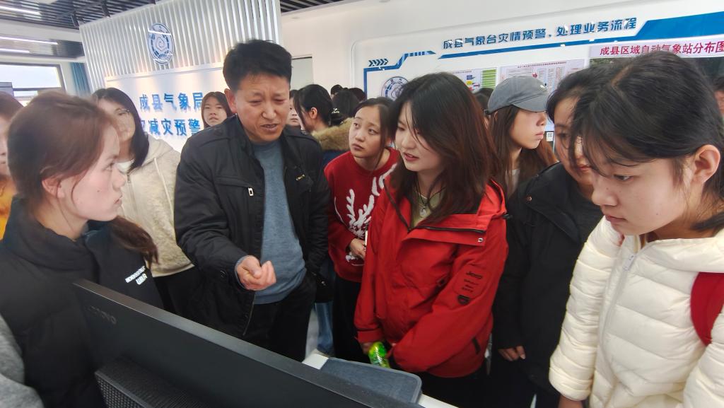 活动当天,教研室主任胡文斌及燕翔、吴生平两位老师带领学生步行抵达成县气象局。抵达后,师生分两组有序参观。在气象局工作人员的引导下,大家首先走进会场,近距离接触气象观测设备,工作人员逐一介绍设备的工作原理和数据采集流程。